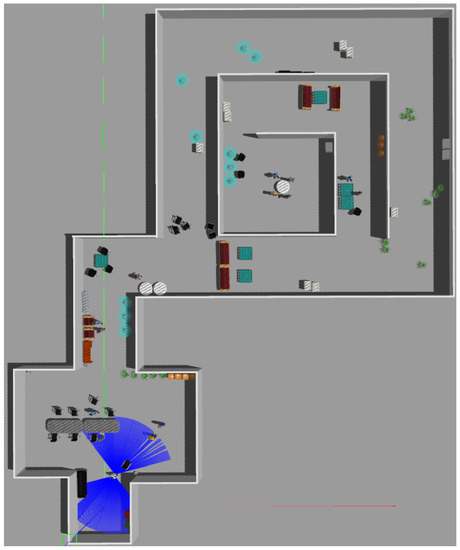 In this section, we evaluate the proposed method on a humanoid robot (i.e., R1, Figure 1) both in a simulation (with R1 simulated in Gazebo) and in the real world. The robot (schematized in Figure 5) is equipped with a front LiDAR (FOV of 80°), a back LiDAR (rpLidar A2M6 with a FOV of 120°) and an Intel Real-sense D415 RGB-D camera (FOV of 70°). The RGB-D camera is mounted on the R1 head whose joint limits are yaw: ± 35° and pitch ± 25°. LiDAR scans are parallel to the floor with an height of 0.20 m and the robot moves at a maximum speed of 0.25 m/s−1. The choice to equip our robot with a simple 2D rpLidar A2M6 is twofold: it allows—in contrast to 3D LiDARS—us to save money and space. The size of the sensor is of particular importance in the case of anthropomorphic robots, as it allows the LiDAR be hidden internally in the robot’s chassis. It is worth considering that readings similar to 3D LiDARs can also be obtained with cheap solutions, for example, by rotating a 2D sensor on its pitch axis in order to reconstruct a 3D image of the surrounding as is carried out for example in [31]. The problem in this case is that obtaining the 3D scan takes a non-negligible amount of time and it requires additional hardware. In addition, implementing a LiDAR rotation system for a robot would require effort and redesign, with consequent higher cost and space requirements. Another limitation is due to the environment scan rate which is strongly reduced as the time for a complete scan is inversely proportional to the number of segments in which we divide the (vertical) rotation angle of the sensor. This may decrease performances when the same sensor is used both for obstacle avoidance and localization because a fast scan rate in the horizontal direction is required for a proper localization. In any case, we decided to compare the use of similar hardware against our method.