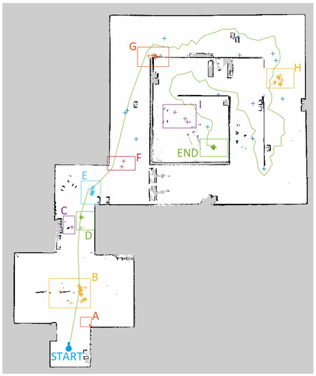 In Figure 9, we plot a representative trajectory followed by the robot during the navigation and we report failure points with crosses (aggregating data from all methodologies), marking with capital letters all the areas in the map in which failure occurred. Comparing this map with the Gazebo world in Figure 8, it is evident how these zones are in correspondence with the obstacles that are the most difficult to detect.