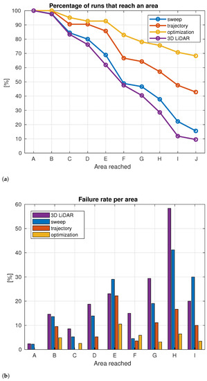 (a) represents the percentage of simulations in which the robot reached a determined area. (b) represents the failure rate per area. Percentage in (a) is calculated over the total simulations. Percentage in (b) is calculated for an area over the total trial runs in which the robot reached the previous area.