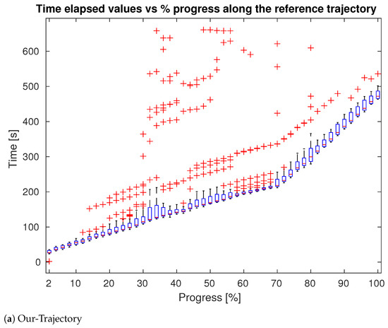 We also evaluated the speed of the navigation, with respect to the optimal global trajectory generated by the Isaac global planner. To this aim, for each trial, we recorded the time required by the robot to reach a given point along the optimal trajectory. The results are plotted in Figure 11, in which for different percentages of progress along the x axis, we report a series of box-plots that represents the time stamp distribution at which the robot reached the related progress. Box-plots were built only using time stamps relative to navigation tests in which the robot had effectively reached the associated progress and no penalties were introduced in case the robot failed to reach a determined progress. The average value of the box-plots was calculated excluding outliers, identified as a value that was more than 1.5 times the interquartile range away from the top or bottom of the box. These outliers (in red) represent “delay points”, in which the robot got stuck for several seconds before resuming the navigation. These points leave a tail of lagging time measures along the whole path. This effect can be clearly seen in Figure 11b, where delay points originate at specific points of the trajectory and maintain a constant offset from the mean value. The average time to reach a determined point in the trajectory is thus similar for the two approaches since in case of a correct navigation the differences in the trajectories are minimal and they do not bring substantial time savings. The main difference, however, is in the number of outliers, i.e., the distribution of the delay points in terms of quantity, dispersion, and absolute values. Figure 11 and Table 1 show that our method performed better in all the three metrics. From Table 1, in particular, we notice that the proposed method had a smaller number of delay points; these values were generated when the robot got stuck during the navigation for a certain period of time. The average value of the outliers is an indicator of this time period. As reported in Table 1, the proposed methodologies significantly reduced the number of delay points and the average delay that each point introduced in the trajectory.