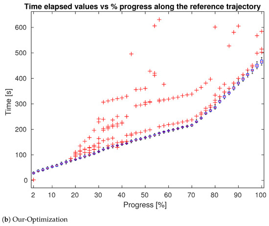 Time stamps values in function of progress percentage along the optimal trajectory. (a) shows performances of our Trajectory method while in in (b) are presented the result for our Optimization method. Box-plot is represented in blue and outliers (delay points) in red. Plot for sweep method not reported since it is similar to trajectory.