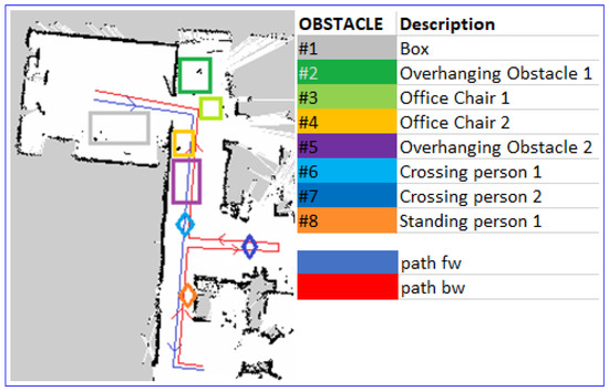 To further validate our approach, we performed experiments on the R1 robot navigating in a common office environment characterized by a mix of obstacles that are difficult to be detected by the LiDAR alone (e.g., office chairs, walking or standing people, overhanging obstacles). The map of the environment and the location of the obstacles are represented in Figure 12.