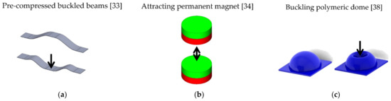 Examples of NBS elements: (a) pre-compressed buckled beam; (b) attracting permanent magnet; (c) buckling polymeric dome.