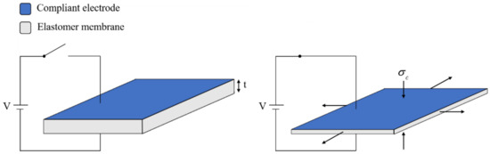 As explained above, a DE consists of a dielectric elastomer film sandwiched between two soft electrodes, forming a flexible capacitor. Its principle of operation is based on the shape change undergone due to the electric field applied through the dielectric. Specifically, when a high voltage is applied to the electrodes, a compressive Maxwell stress σe is generated, quantified as follows: