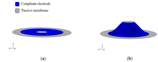 In this work we will focus on a specific DEA geometry, namely the circular out-of-plane DEA (COP-DEA) depicted in Figure 3, in both the undeformed (a) and the deformed out-of-plane (b) configurations. The actuators is based on a silicone DE membranes (Elastosil 2030 by Wacker Chemie [46]), with thickness of 50 μm and inner radius equals to 10 mm, in combination with the sputtered metallic electrodes mentioned in Section 2.1. The biasing element is connected to the passive center part of the DE membrane. When a voltage is applied, the center passive part is pushed upwards, thus generating an out-of-plane stroke.