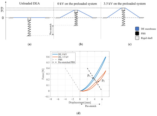 (a–c) Sketch of the DEA actuator composed by a DE membrane coupled with a PBS element, for three different configurations. (d) Actuator force equilibrium analysis, intersection points p1 and p2 represents the equilibrium states obtained by switching the voltage.