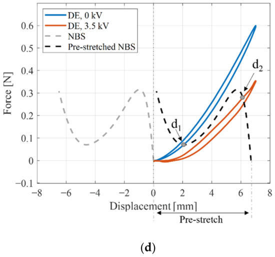 To better clarify the importance of the biasing mechanism, as well as to understand how to quantify the stroke, Figure 4 and Figure 5 show a cross-sectional view of the entire DEA, consisting of a COP-DEA (depicted in blue). The actuator in Figure 4 is coupled with a positive-rate biasing spring (PBS), while the one in Figure 5 is pre-loaded with an NBS (both depicted in black). To compare the strokes obtained with the two types of mechanisms, one shall consider the force–displacement characteristic curves describing the operating range of the system, sketched in the lower parts of Figure 4 and Figure 5. In particular, the blue and red continuous lines show the behavior of the DE without and with the high voltage applied. Note how the electrical activation results in an overall softening of the elastomer membrane. The dashed curves, instead, represents the qualitative behavior of the corresponding biasing element. Note that the spring rate of the PBS appears as negative in Figure 4, while the NBS curve shows a region of quasi-linear and positive stiffness in Figure 5. This apparent change in sign of the expected slope is due to the fact that we are plotting the bias force with respect to the DE membrane displacement. Note also that, by changing the pre-stretch of the biasing element (with respect to the DE), it is possible to shift the corresponding characteristic curve along the x-axis. Notably, the gray curve represents the PBS (cf. Figure 4) and NBS (cf. Figure 5) when the DE membrane is in the undeformed configuration (cf. Figure 4a and Figure 5a), while the black ones describe the biasing elements after that the DE membrane has been preloaded out-of-plane (cf. Figure 4b and Figure 5)). By using a simple force equilibrium argument, it can be concluded that the intersection points between the force–displacement characteristics of the DE and the biasing mechanism determine the equilibrium states the actuator. Note that the equilibrium state explicitly depends on the applied voltage. Therefore, the horizontal distance between low and high voltage equilibrium points defines the DEA stroke. The equilibrium points reached by the whole system before and after electrical activation are called p1, p2 for the PBS and d1, d2 for the NBS, respectively. By comparing those two cases, the performance gain achieved with the NBS can readily be observed.