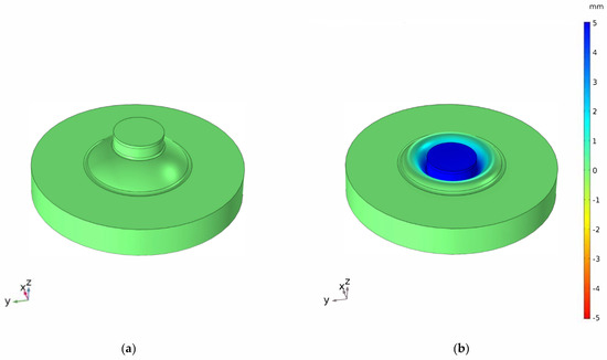Three-dimensional (3D) FE of the dome, obtained from a rotation of the 2D model in Figure 8 along the z axis: (a) Undeformed configuration; (b) Deformed configuration.
