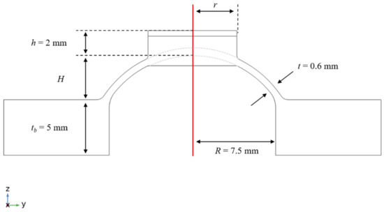 The relevant geometric parameters of the considered dome are highlighted in Figure 10. Starting from a spherical structure with wall thickness t, a flat top part with height h and radius r is added, in order to implement the connection with the DE membrane. During characterization experiments, a displacement is prescribed in the central flat part via a linear motor, and the resulting reaction force is evaluated by means of a load cell. An indenter, having also radius equal to r, is used in the experimental setup, to ensure a homogeneous distribution of the external load force on the top part (see [38] for details). An additional benefit of this design solution is the already available flat base, which offers a further support to connect the DE membrane. With regards to the FE model, the addition of this extra component allows bypassing of the simulation of the structure compressive stress through a prescribed in-point displacement, which is an important prerequisite for a correct post-buckling analysis. Indeed, the knowledge of the surface on which compression occurs facilitates the computation of the resulting force. Furthermore, the selection of a bottom base height of tb permits avoiding taking into account tolerance errors in the dome clamping phase, resulting in more repeatable experimental results.