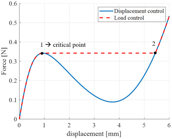 - Load control mode: the load force must necessarily be prescribed via nonlinear dynamic solver to solve the singularity of the problem, thus performing a time-dependent study. If a time-based analysis is conducted, there is a balance between the applied external load and elastic forces (note that all dynamic forces are neglected in this study). After that, the axial displacement represents the quantity calculated as the output. The final result is equivalent to the dashed red curve depicted in Figure 11, in which the dynamic jump from state 1 to state 2 is clearly visible.