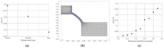 Mesh convergence study: (a) quantifies the average percentage error between the curve obtained by setting the mesh extremely fine (considered as reference) and the other default types listed on the x-axis; (b) 2D FEM, with mesh defined as normal and customized along the blue edges. (c) quantifies the average percentage error between the characteristics curves resulting from varying the maximum size of the mesh elements along the blue edges.