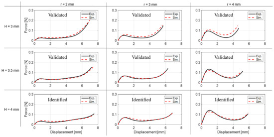 Calibration of all parameters is performed based on a repeatable set of experimental data, characterized through a procedure described in the previous section. The considered dataset contains force–displacement characteristic curves for different dome geometric configurations, built through different combinations of H and r values (cf. Figure 10). The measured force–displacement curves exhibit a moderate hysteresis, which is due to the polymeric material viscoelastic behavior. As this paper represents the first attempt at model-based dome optimization for DEA systems, we decided to neglect hysteresis modeling due to its high numerical complexity (as stated in Section 3). Such a hysteresis introduces a continuous range of possible intersections between the DE and bias curves (recall the argument in Section 2.2). Among all those values, the system naturally choses the equilibrium position which minimizes the motion range and, in turn, the actuation stroke. Therefore, we expected that neglecting the hysteresis will produce an overestimation of the true performance. Keeping this aspect in mind, the original dataset is post-processed by replacing the experimental characteristic curves with interpolating polynomial functions. The corresponding experimental curves are shown as solid black lines in Figure 13. Table 1 provides an overview of the considered geometric values, and how the dataset is split for the calibration and validation steps. The different values of H are chosen according to a preliminary investigation carried out by Madhukar et al. [36], thus resulting in a final height of the dome that ensures a monostable behavior. The range for r, instead, is chosen in such a way to match the inner radius of the experimental DE [38]. Note that 3 experiments are used for calibration and 6 for validation, respectively.