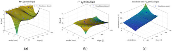 Figure 15. Surface fitting functions created based on the simulations dataset, with the final goal of deriving the dome geometric values for H and r based on the desired performance: (a) H as a function of stroke and slope; (b) r as a function of stroke and slope; (c) maximum force as a function of stroke and slope.
