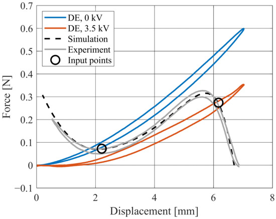 For a better understanding of the working principle, and to verify the reliability of the design optimization algorithm, a design case study is presented in this section. The considered DE membrane is the same as the one described in Section 2. Starting from the measured COP-DEA characteristic curves (depicted in blue and red for low and high voltage, respectively), we define the desired intersection points (marked with black circles), which lead to a desired stroke of 3.6 mm. These points are then used to generate inputs for the design algorithm, which leads optimal geometry values equal to H = 4.6 mm and r = 4.8 mm. Note that those value fall outside the calibration and validation dataset shown in Figure 13, thus the optimal design relies on an extrapolation performed by our model.