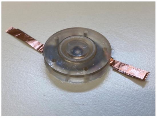 The optimal dome is then coupled with the DE membrane and used to manufacture a complete actuator system. A picture of the assembled DEA device is shown in Figure 17. Manufacturing and assembly are performed similarly to [38]. In particular, before assembly, the electrical connections to the metal electrodes are achieved through a copper tape. Then, a double-sided tape cut with a cutting machine is used to couple the optimal polymer dome with the DE membrane. The assembly is performed through the use of 3D-printed tools, thus avoiding manual positioning and allowing improvement in the accuracy. As the DE is controlled with high voltage, it has been placed underneath the insulating dome in order to operate in total safety.