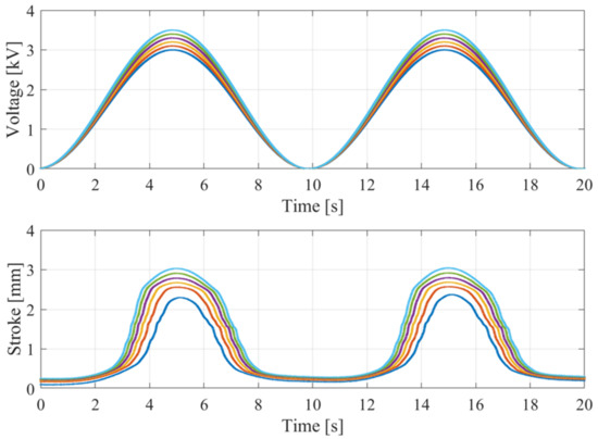 The upper part shows a sinusoidal voltage signal applied as input, at the frequency of 0.1 Hz. The different colors represent signals of different amplitudes set as the input, which vary in the range 3–3.5 kV with increments of 0.1 kV. In the lower part, the corresponding stroke reached by the DEA is depicted.