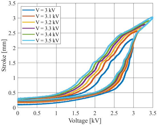 After completing the actuator manufacturing, an electro-mechanical characterization is performed with the aim of evaluating the stroke achieved for different input voltage signals. The motion of the DEA flat top is measured through a Laser (Keyence, model: LK-G87), while the analog voltage output of the voltage amplifier is monitored through NI LabVIEW module (PXI-7852). A first set of tests is conducted by considering a constant voltage step, which is applied for a total duration of 10 s. Several steps are considered, each one ranging from 0 kV up to a different maximum value ranging from 3 kV to 3.5 kV, with steps of 0.1 kV. The minimum voltage is set to 0 kV, as it corresponds to zero actuation force, while the maximum voltage value is limited by the dielectric breakdown field strength (i.e., EDE = [80–100] V/µm) [46]. The results are shown in Figure 18. For the maximum voltage, a stroke of about 3.1 mm is observed. This quantity is smaller than the theoretical value of 3.8 mm predicted with the graphical method, possibly due to unavoidable tolerances, misalignments, and inaccuracies occurring during the manufacturing process.