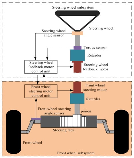 The architecture of the SBW system is illustrated in Figure 2. The steering wheel angle sensor can detect the actual driver steering angle, and the steering angle can be transmitted to the front wheel subsystem. The function of the front wheel subsystem is to track the expected front wheel steering angle.