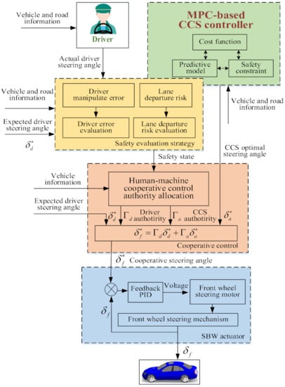 As shown in Figure 3, the cooperative control scheme contains two intelligent agents (driver and CCS). The actual driver steering behavior is detected by a sensor. At the same time, an MPC-based CCS controller is developed for lane keeping. Additionally, a safety evaluation strategy is proposed for safety supervision, containing real-time assessments of driver error and lane departure risk. Then, a dynamic authority allocation method is designed to weigh lane keeping performance and driving freedom. Finally, the SBW system is used as an actuator, and a feedback PID is employed to reduce the deviation of the cooperative steering angle and actual steering angle.