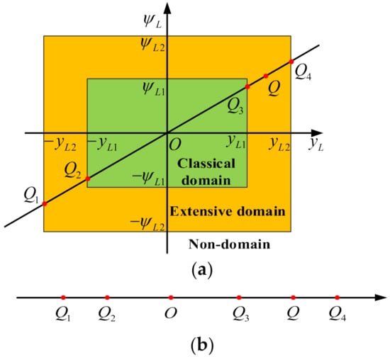 The correlation degree refers to the correlation function value based on current characteristic variables. It is assumed that the permitted ranges of the lateral position deviation and direction deviation are and (). The optimal point is origin point . As shown in Figure 4a, is the current system state point. The intersections of and the classical domain and extensive domain are , , , and . Thus, the two-dimensional extension set is transformed into a one-dimensional set, as depicted in Figure 4b.