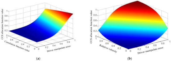 CCS authority weight: (a) CCS authority weight with variations in correlation function value and driver manipulation error; (b) CCS authority weight with variations in relative velocity and driver manipulation error.