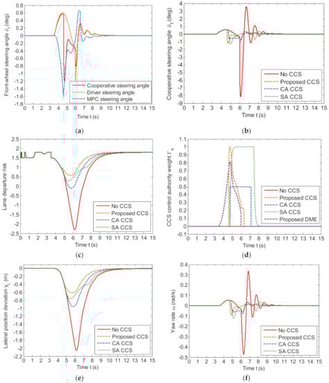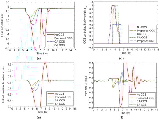 As shown in Figure 8a, the proposed CCS cannot immediately correct the error when the driver maintains a wrong steering angle, and the driver has full control authority. Compared with the continuous cooperative control for reducing lateral deviation during the whole driving process, the driver has full driving freedom when the lane departure risk is greater than 0.8, as shown in Figure 8c,d. The angle generated by the proposed method is larger than that of the CA CCS and SA CCS methods at 4.4 s to quickly correct driver error, as shown in Figure 8b. From the perspective of lane keeping performance, the No CCS method results in the vehicle being outside of the lane. The proposed method reduces the maximum lateral position deviation by 46 percent and 31.4 percent compared to the CA CCS and SA CCS methods, as shown in Figure 8e. As for driving freedom, the proposed CCS authority is reduced as driver error declines, as shown in Figure 8d. The proposed method decreases the cooperative control time by 14.4 percent and 18.4 percent compared to the CA CCS and SA CCS methods. As shown in Figure 8f, the yaw rate of the No CCS method exceeds the allowable value 0.42 rad/s, and vehicles controlled by other methods are in stable states.