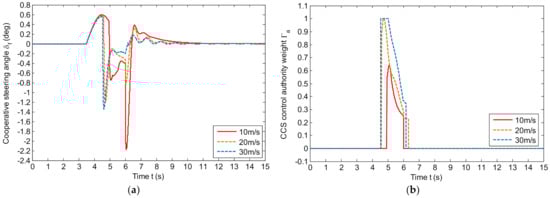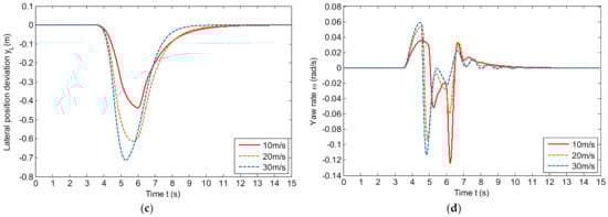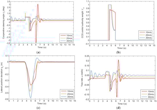 Figure 9a,b show the cooperative steering angles and cooperative control authority weights under different velocity conditions. The cooperative steering angle is the same as the driver steering angle before 4.32 s because the CCS authority weight is zero. At the cooperative control stage, the controller calculates an optimal angle to correct the driver’s manipulation error. Authority weight decreases with the decrease in speed. As shown in Figure 9c, the deviation decreases with reductions in velocity, and the vehicle travels in the lane under three velocity conditions. The yaw rates reflect the stable states of the vehicle, as shown in Figure 9d.