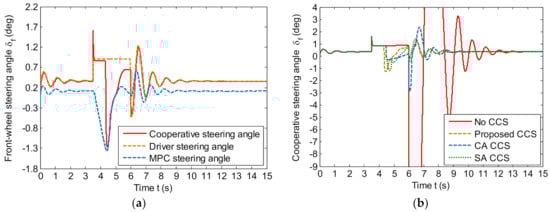 This scenario is designed to verify the contributions of the proposed scheme by comparison of different methods. The vehicle travels along the center of a straight road for m/s. The driver generates the manipulation error at time t = 3.5 s, and the erroneous steering wheel angle is degrees. There are three methods established for comparison in the above same driving scenario; No CCS denotes that the driver controls the vehicle independently. Inspired by the ideas of Zhang et al. [] and Guo et al. [], we establish the constant authority method and authority transfer method; CA CCS denotes that the driver and the CCS share constant control authority with respect to the lateral position deviation. The cooperative control authority is . SA CCS denotes that authority switches smoothly between the driver and the CCS according to the lateral position deviation. The cooperative control authority is . A first-order inertial element with time lag ta is used to generate a smooth variation between zero and one.