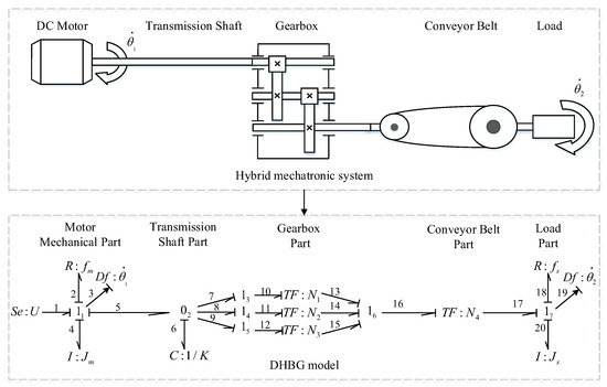 Hybrid mechatronic systems, which include interacting continuous and discrete dynamics, are widely used in modern industrial systems, such as automobile, chemical plant, and aerospace engineering [1,2]. As their complexities increase, higher demand on safety and reliability requires more accurate fault diagnosis and failure prognosis which could provide effective means for system maintenance. Consequently, it is important to detect and isolate system faults as soon as possible and then considerable economic losses can be avoided [3,4,5]. Since recent years, many valuable works have been reported in the hybrid system fault diagnosis and prognosis fields [6,7,8,9,10]. Among these works, discrete event system model-based methods (e.g., Petri net and automaton) are widely investigated. The timed Petri net model is used for mode tracking and fault diagnosis of hybrid systems [6]. This model can only depict the temporal discrete event degradation of the hybrid system because the continuous dynamics is neglected. The main problem of this method is that domain-specific knowledge is required to build the fault–symptom table. In addition, training data obtained from reliability testing are needed to compute the individual faults prior probability distributions. The hybrid automaton model is utilized for fault diagnosis of hybrid systems based on structured residuals [7]. The hybrid automaton model consists of finite state automaton and continuous state-space model. The continuous state-space model is used to derive structured residuals for fault detection. The structured residuals can generate the fault signatures for fault isolation. However, for complex hybrid systems with many modes, this method needs to derive a large number of state-space models. Therefore, it is difficult to design fault diagnosis algorithms and real-time implementation under this situation. Fortunately, hybrid bond graph (HBG), which is a graphical tool only, utilizes a set of unified equations (i.e., global analytical redundancy relations (GARR)) for fault diagnosis where information of all modes and physical component faults are incorporated [10]. According to GARRs, the fault signature matrix (FSM) and mode change signature matrix (MCSM) can be established, based on which the isolation of unexpected mode change and component fault can be carried out.