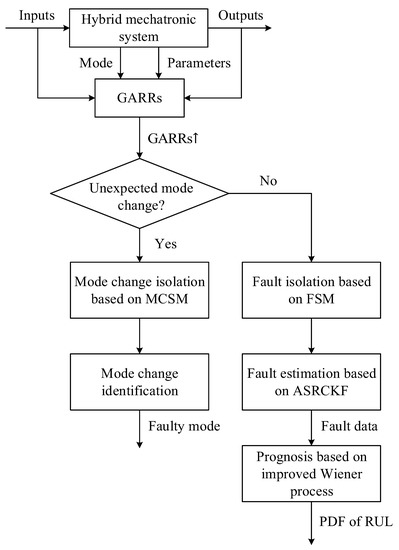 In this article, a computational intelligence-based prognosis method is developed for the hybrid mechatronic system. Specifically, three main works are presented as follows (according to different sections): (1) GARRs derived by the DHBG are utilized to obtain MCSM and FSM, based on which both the unexpected mode changes and SFC can be isolated; (2) a novel filtering algorithm called ASRCKF is proposed for parameter estimation in the presence of unknown noise distributions. The ASRCKF functions better than other filtering methods (such as EKF and UKF); (3) the improved Wiener process incorporating nonlinear term is developed to capture the degradation of incipient fault, where the nonlinearity and randomness of degradation process are both taken into account. In addition, to ensure the accuracy of estimate, the FKH is proposed to estimate the degradation model coefficients efficiently.