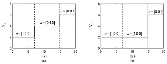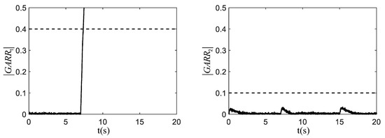 In the first fault scenario, the desired in operation and the actual in operation are shown in Figure 3, where the state of mode changes at 7 s and 15 s. The mode fault is set as between 7 s and 15 s, where the actual is 2 (while the desired is 4). Figure 4 illustrates the residual responses where all residuals exceed the thresholds (i.e., and ) at 7 s. After that, the condition monitoring system is enabled to check whether the inconsistency is due to a mode fault by comparing the CV = with the MCSM. Thus, and are two possible fault modes that may lead to the inconsistency. However, substituting into GARRs cannot make GARRs consistent. Therefore, the possible fault mode is , and the GARRs will return within the threshold after a is set as .