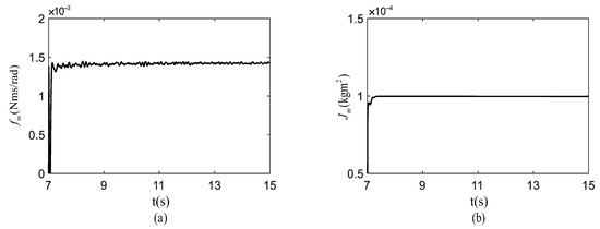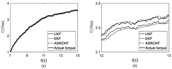 In the second fault scenario, the normal torque of the actuator is 1 Nm and an incipient fault of the actuator is injected at 7 s. The degradation law of incipient fault is defined as , where is 7 s and is the Brownian motion which represents the randomness of degradation process. Figure 5 shows the responses of residuals by which the CV is after fault occurrence. As the nonzero CV has no matching in the MCSM, the possibility of mode fault is ruled out and SFC is obtained as by comparing CV with the FSM. To refine the SFC, the fault estimation module is activated by using the ASRCKF. Estimation results of and by ASRCKF are shown in Figure 6. According to estimation results, and are excluded from the SFC because their estimated values are close to the nominal ones. Figure 7a illustrates the estimated U where the estimated value significantly deviates from the nominal one. As a result, the true fault is U. To verify the superiority of ASRCKF, the EKF and UKF are also adopted to estimate U for comparison. Initial parameters for all filters are set as = diag(0.01,0.01,0.01,0.01,0.01,0.01,0.01), = diag(0.1,0.1,0.1,0.1,0.1,0.1,0.1) and = diag(0.01,0.01).
