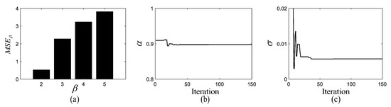 After fault estimation, the estimation of the degradation model (i.e., the improved Wiener process) coefficients can be implemented using the estimated fault data of U. The estimate of using the least square method is shown in Figure 8a. It is observed that increases as increases, and reaches the minimum value when is equal to 2. Thus, the optimal value of is 2. In Figure 8b,c, the estimation results of and are obtained by the FKH. Initial parameters for KH and FKH are set as , , , , , , and . Both KH and FKH run 10 times based on the same estimated fault data of U, and the comparison of estimation results is given in Table 5. It can be observed from the table that KH and FKH could achieve similar estimation results. However, compared with KH, it is found that FKH is more efficient in terms of the convergence speed.