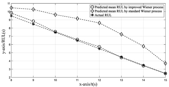 After the degradation model coefficients are obtained, RUL prediction can be carried out. The failure threshold of U is 4 Nm. Based on the estimated degradation model coefficients and (34), the PDF of RUL can be obtained. In Figure 9a, the x-axis, y-axis, and z-axis represent the time index, RUL, and the PDF of RUL. At each chosen instant, there is a curve (denoted by a solid line) covering different RULs. It is observed that actual RULs fall outside the coverage of the PDFs of RULs predicted by the standard Wiener process. The unsuccessful RUL prediction is due to the limited fitting capability of the standard Wiener process (i.e., only applicable to linear degradation process). In Figure 9b, the axes are set the same as in Figure 9a. It is found that the actual RULs are enveloped by the PDFs of RULs obtained by the improved Wiener process which is not the case for the standard Wiener process. For intuitive comparison, the top views of Figure 9a,b are combined to form Figure 10 where x-axis and y-axis still represent the time index and RUL. In Figure 10, the predicted mean RUL by standard Wiener process cannot track the actual RUL since only linear term is used. By contrast, the predicted mean RUL by improved Wiener process shows consistency with the corresponding actual RUL. Consequently, the proposed prognosis method using improved Wiener process performs better than the one using standard Wiener process.