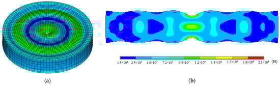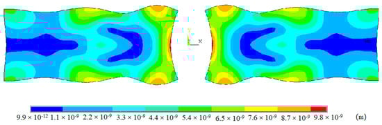 The fundamental frequency of the thickness vibration is simulated and calculated, as shown in Figure 2. The fundamental frequency of thickness vibration is clearly affected by the higher-order vibration mode of radial vibration. The vibration amplitude at the surface is distributed symmetrically with the center of the circle as the axis. The vibration amplitude is uneven and wavy. The vibration amplitude near the center of the circle is large, and the vibration amplitude along the radial direction becomes wavy.