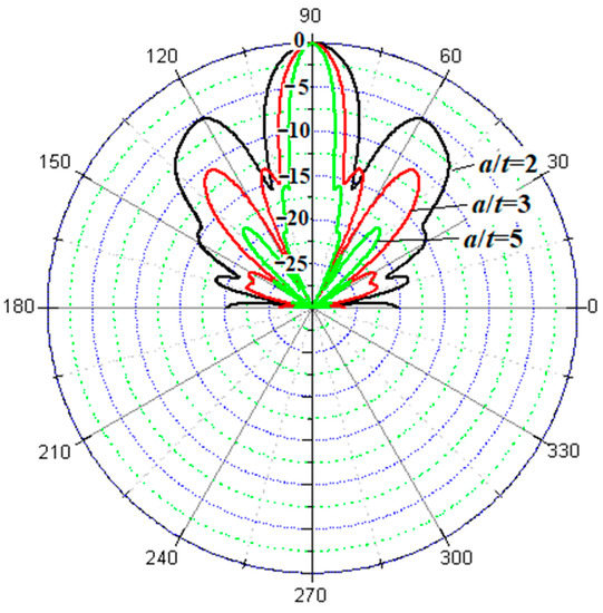 Due to the limitation of working frequency and directivity open angle, the diameter thickness ratio of the piezoelectric disc is usually between 1 and 10. Figure 3 shows that the sidelobe level decreases with the increase of a/t. In order to obtain the vibration transducer with sidelobe level lower than −10.5 dB, the diameter thickness ratio of piezoelectric disc is required to be a/t > 3. In this range, if the diameter thickness ratio a/t is appropriate, the coupling will be weak, and there is no coupling vibration resonance peak in the vicinity of 10% of the thickness vibration frequency. When a/t is small, it has a great influence on the directional sidelobe level of the transducer.