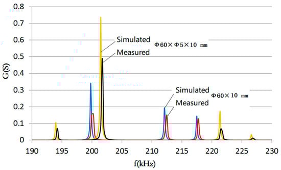where are the compliance constant of piezoelectric ceramics. The values of i and j are 1, 2, 3…, and correspond to the higher-order frequency of thickness vibration and the higher-order frequency of radial vibration respectively. is the root of equation . and are the zero order and first order of the Bessel function of the first kind. The coupling coefficient n is solved from Equation (1), and then the higher order frequency of radial and thick vibration can be obtained by substituting Equations (2) and (3). From the calculation formula, considering the coupling, the radial vibration frequency is not only related to the material parameters, diameter size, but also the ratio of thickness to diameter, and the thickness vibration frequency is the same. Therefore, the material type, size and structure shape should be further considered.