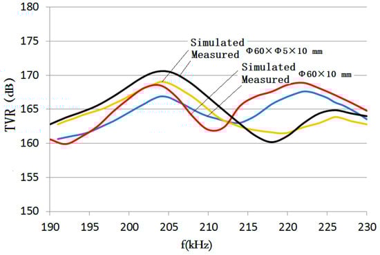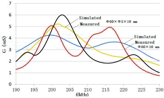 In this paper, a piezoelectric disc transducer with a hole in the center and a conventional piezoelectric disc transducer are designed. The size of the piezoelectric disc transducer with a hole in the center is Φ60 × Φ5 × 10 mm, and that of the conventional piezoelectric disc transducer is Φ60 × 10 mm. Figure 8 and Figure 9 are the simulation and measurement results of the underwater conductivity characteristics and transmission voltage response level curves of the two transducers, respectively. The results show that there is only one strong main peak in the water conductivity curve and transmission voltage response curve of the piezoelectric disc transducer with a hole in the center at the thickness vibration frequency, and the conductance value and transmission voltage response level value increase, and the response increase value is consistent with the simulation results, which shows that the simulation results are effective and accurate.