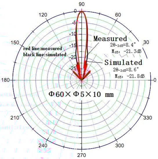 Figure 10 shows the directivity of the high-frequency transducers with a center hole at 200 kHz. Through comparative analysis, the measured thickness of the vibration transducer with a 5 mm disc hole in the center increases the main lobe beam width by 0.7° and decreases the sidelobe level by 1.3 dB.