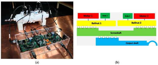 The mechanical transmission of the EMA is based on differential ball-screws couplings. The two motors engage, via rotor-integrated ball-nuts, an intermediate screwshaft having three threaded portions: two external ones for the motors and an internal one for the output shaft, Figure 1b. The kinematics thus implements a speed-summing paradigm and the relationships between the motors rotational speeds ( and ), the output translational speed () and the screwshaft translational and rotational speeds ( and ) are given by Equations (1)–(3),
