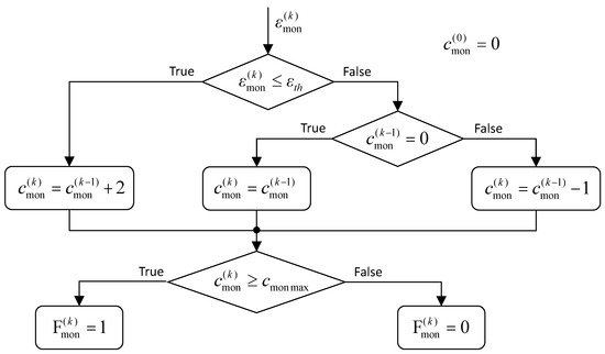 Each algorithm section uses a generalized Jamming-Detection Logic (JDL), whose flow chart is reported in Figure 3: the fault flag (Fmon) is generated by elaborating a monitor signal (εmon) sampled at the monitoring frequency (fmon). If the monitor signal is lower than a pre-defined threshold (εth), a fault counter (cmon) is increased by 2; if the threshold is exceeded, the fault counter is decreased by 1 if it is positive at the previous step, otherwise it is held at 0. The jamming is detected, when the fault counter exceeds a pre-defined value (cmon max, which basically defines the FDI latency).