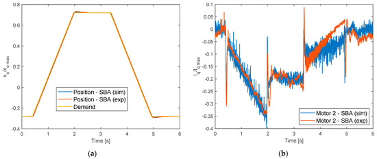 Time-domain model validation: position tracking in SBA mode with 100 kN/m spring-type loading (in Equation (24), ke = 105 N/m); (a) output position; (b) motors quadrature currents (xo max = 25 × 10−3 m; Iq max = 25 A).