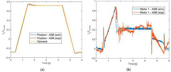 Time-domain model validation: position tracking in ASB mode with 100 kN/m spring-type loading (in Equation (24), ke = 105 N/m); (a) output position; (b) motors quadrature currents (xo max = 25 × 10−3 m; Iq max = 25 A).