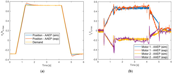 Time-domain model validation: position tracking in AAEP mode with 100 kN/m spring-type loading (in Equation (24), ke = 105 N/m); (a) output position; (b) motors quadrature currents (xo max = 25 × 10−3 m; Iq max = 25 A).