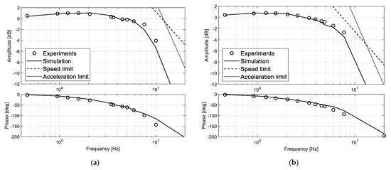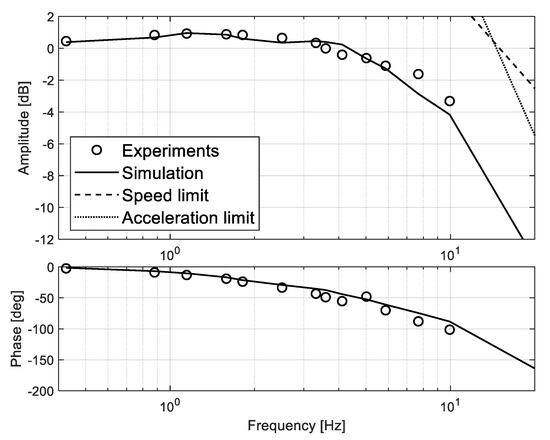 Excerpts of results of the frequency-domain validation of the model are then reported from Figure 9, Figure 10 and Figure 11, in which the position tracking responses to sinusoidal demand waves of 0.5 mm (i.e., 1% of the EMA full stroke) under a 2 kN compressive load are proposed in terms of amplitude and phase of the first harmonic signal component. The plots also report the speed and acceleration limits of the EMA and it can be verified that, in the examined frequency range and for all operative modes, the system works without encountering saturation phenomena.
