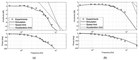 Frequency-domain model validation: position tracking at 1% maximum demand amplitude (0.5 mm), with 2 kN compressive load; (a) ASB mode; (b) SBA mode.