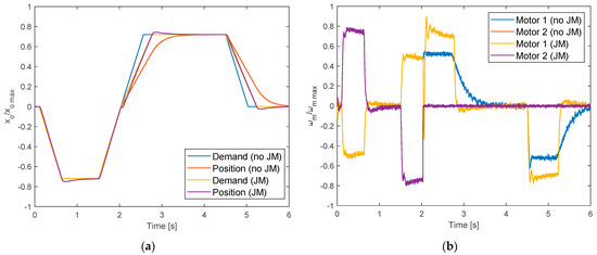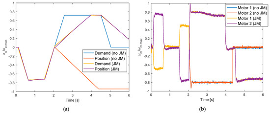 Jamming Monitor (JM) effect with block of screwshaft rotation (jamming of the internal screw-nut coupling) at 2.03 s (FDI latency = 90 ms); (a) output position; (b) motors speeds.