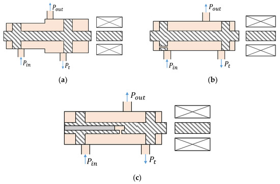 Types of pressure-reducing spools. (a) Differential-area type spool. (b) Differential-pressure type spool. (c) Spool used in this study.