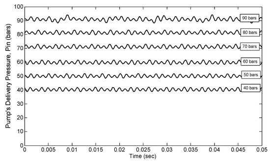The inlet pressure fluctuations, as expressed in Figure 5, depend on the pump operation technique. The pump involved in this study is a piston pump that relies on a number of reciprocating cylinders to build and deliver pressure. In any type of pump, the delivery pressure cannot be perfectly maintained at a constant value. Numerous studies on pressure pulsations in hydraulic pumps show that such a phenomenon should not be ignored when solving the mathematical model [27,28,29]. This factor is thus taken into account by providing the pump test data to the Simulink model in order to create realistic input conditions for simulation. The details of how the test data were obtained through experiments are shown in Figure 4 and Figure 5.