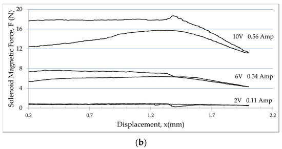 Figure 6b shows that the maximum solenoid force can be estimated at 17 N, which is why it was decided to use the solenoid force lower than 17 N when running the Simulink model. The sensor specifications are shown in Table 3.